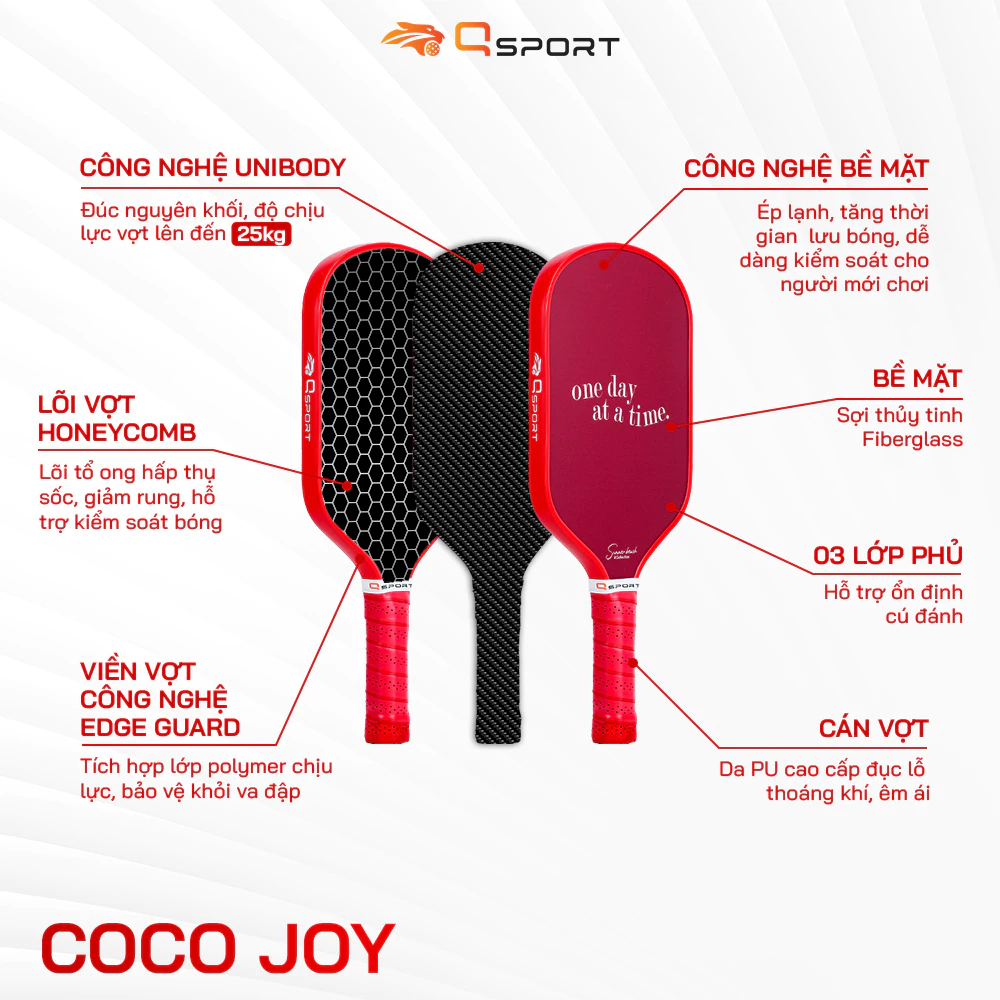 Vợt Pickleball Qsport Coco Joy sử dụng công nghệ ép lạnh, tăng thời gian lưu bóng, dễ dàng kiểm soát cho người mới chơi