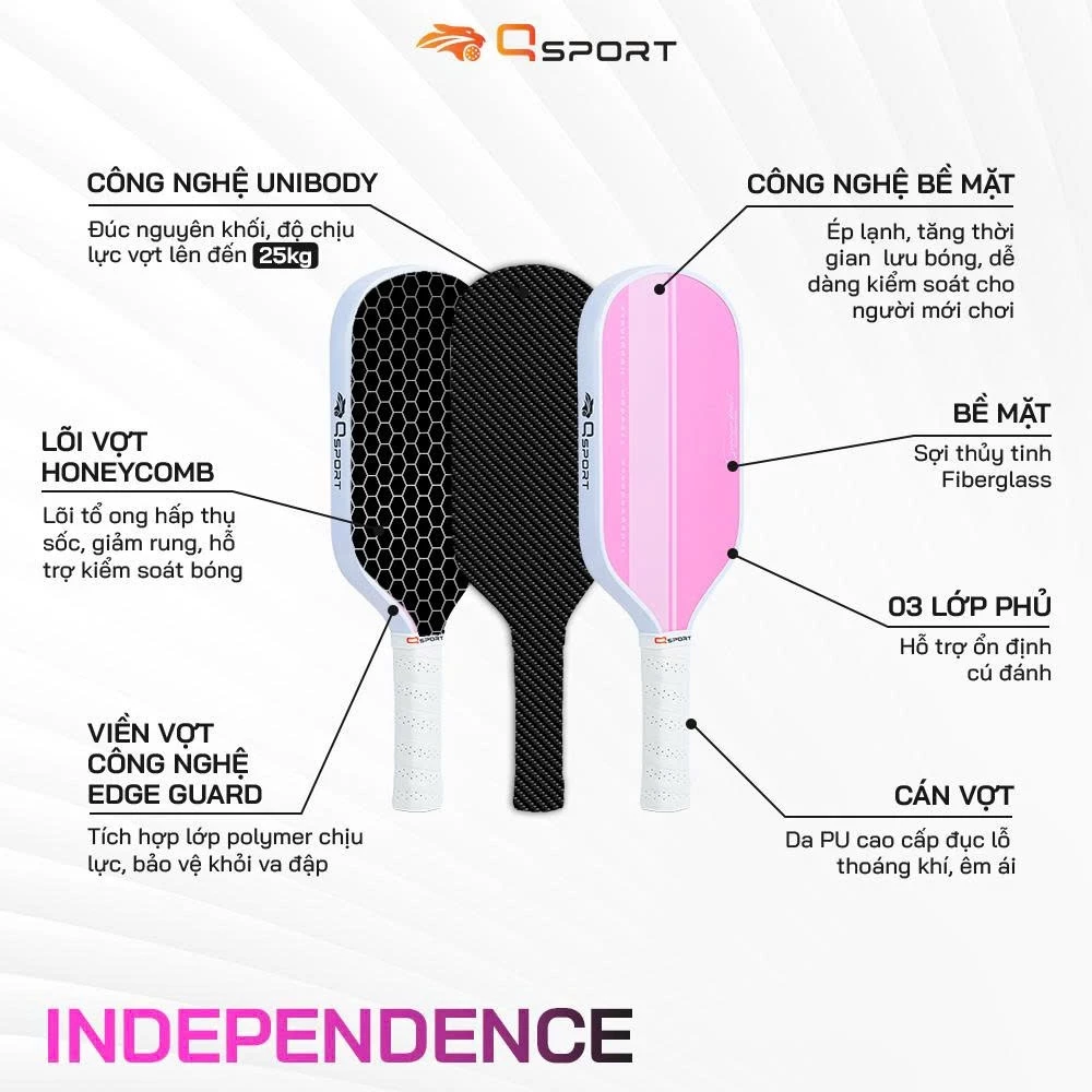 Vợt Pickleball Qsport Independence sử dụng công nghệ ép lạnh, tăng thời gian lưu bóng, dễ dàng kiểm soátcho người mới chơi