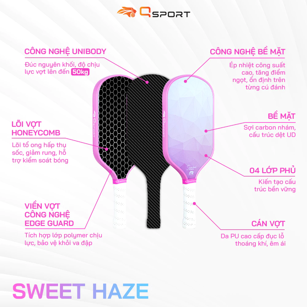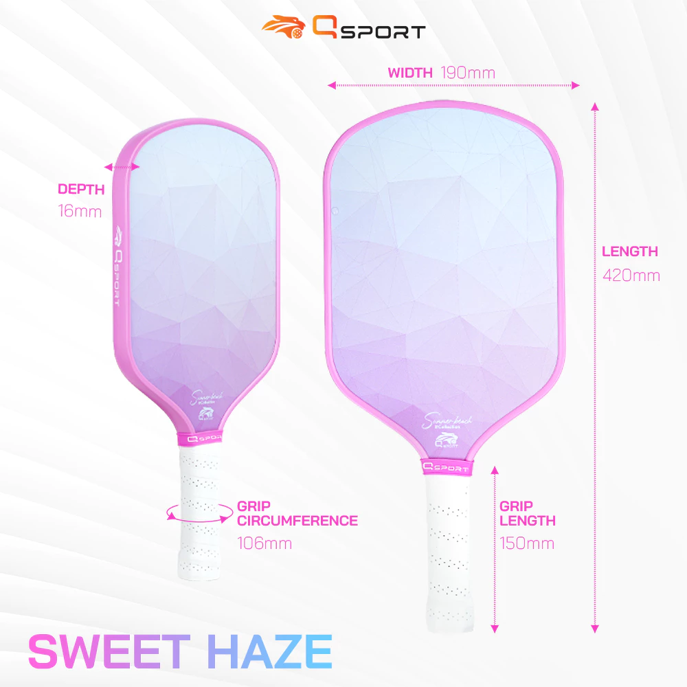 Vợt Pickleball Qsport Sweet Haze sử dụng công nghệ ép nhiệt công suất cao, tăng điểm ngọt, ổn định trên từng cú đánh.